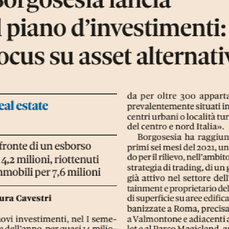 Borgosesia lancia il piano d’investimenti: focus su asset alternativi