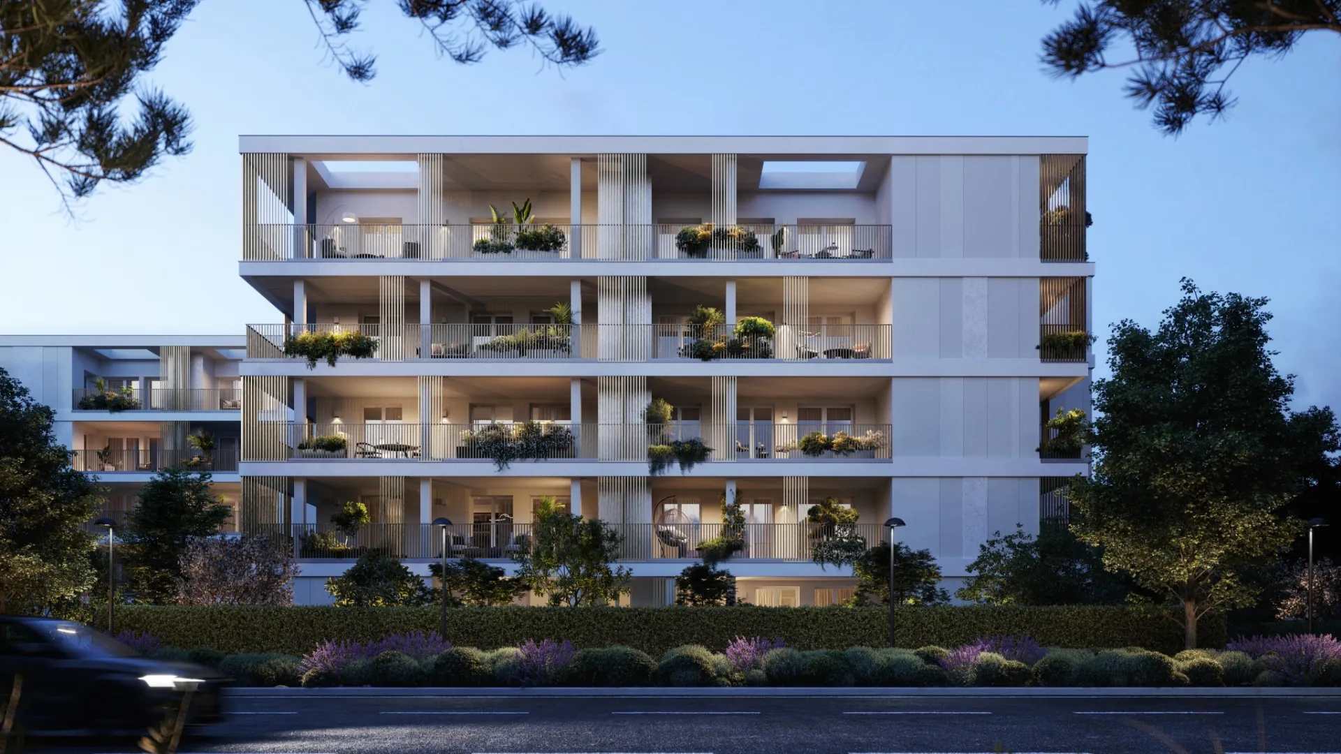 58 alloggi, di tipologia bilocale, trilocale, quadrilocale. Un livello interrato adibito ad autorimessa con circa 116 parcheggi tra box (doppi e singoli) e posti auto. Sempre al livello interrato si trovano i locali tecnici e locali rifiuti. Inoltre, vi è un’ampia area di pertinenza esterna al piano terra, suddivisa in giardino condominiale e giardini privati di pertinenza degli alloggi al piano terra. Il giardino condominiale ha caratteristiche atte per essere attrezzato con un’area giochi, un’area relax, outdoor fitness area, parcheggio bici e prevede anche spazi comuni coperti, ideali per attività all’esterno; inoltre, è previsto un locale comune chiuso non riscaldato che potrà essere attrezzato dal Condominio secondo le proprie esigenze. Le facciate sono realizzate con soluzioni tecniche per la correzione totale dei ponti termici (tipo cappotto o similare), caratterizzate da differenti finiture di intonaco a definire delle campiture rettangolari sui prospetti. I parapetti e le recinzioni perimetrali sono composte da pannelli con profili metallici prefabbricati oppure con profili metallici su disegno.